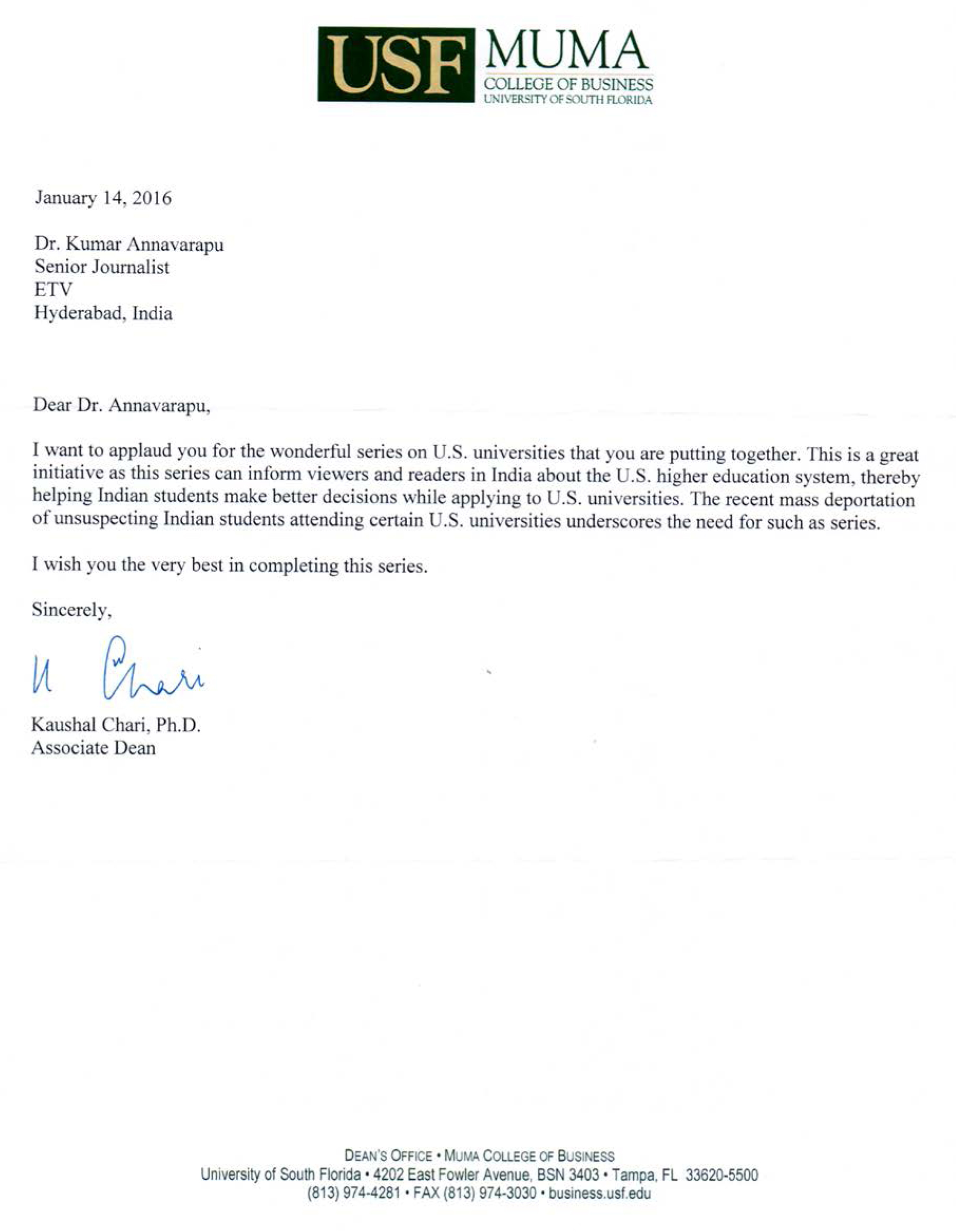 Dr. Annavarapu and his team very accommodative to work diligently with our International admissions office, office of student's affairs, office of marketing and communications, office of the Provost and office of the President. Kumar's passion in higher education and to create such an American Education Project to prospective students, faculty, and administrators of higher education in India is commendable.