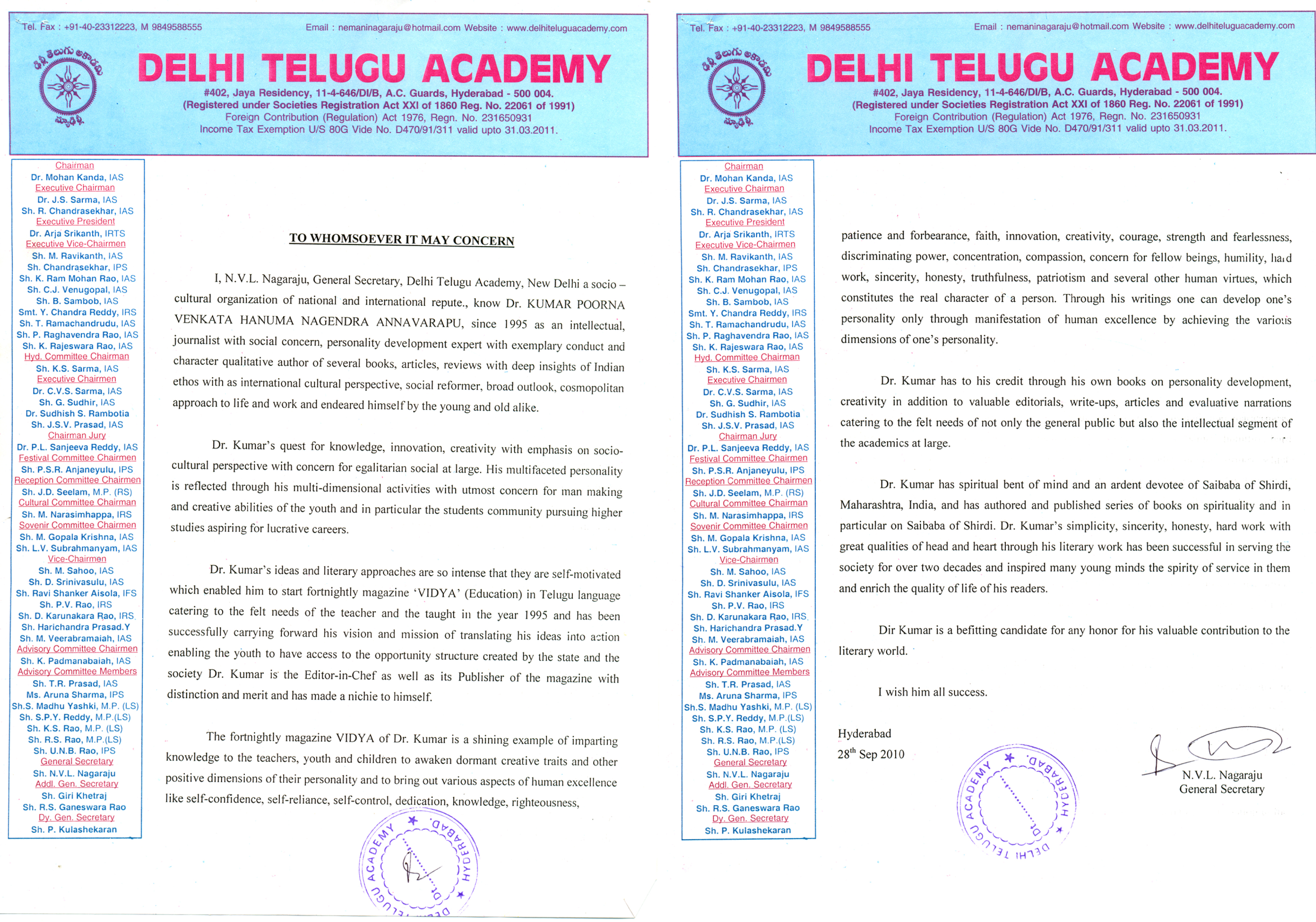 “Dr Kumar Annavarapu is a leading personality development writer in Telugu language. I know Dr. Kumar for the last one and half decades as a journalist, scholar, writer, editor of Vidya Magazine and a carrier counsellor for the youth. His writings are of great help to the youth from rural areas and from the weaker sections of the society. He has pleasing manners and amicable temperament and with his sterling qualities he will be able to perform any higher responsibilities with devotion and dedication.”