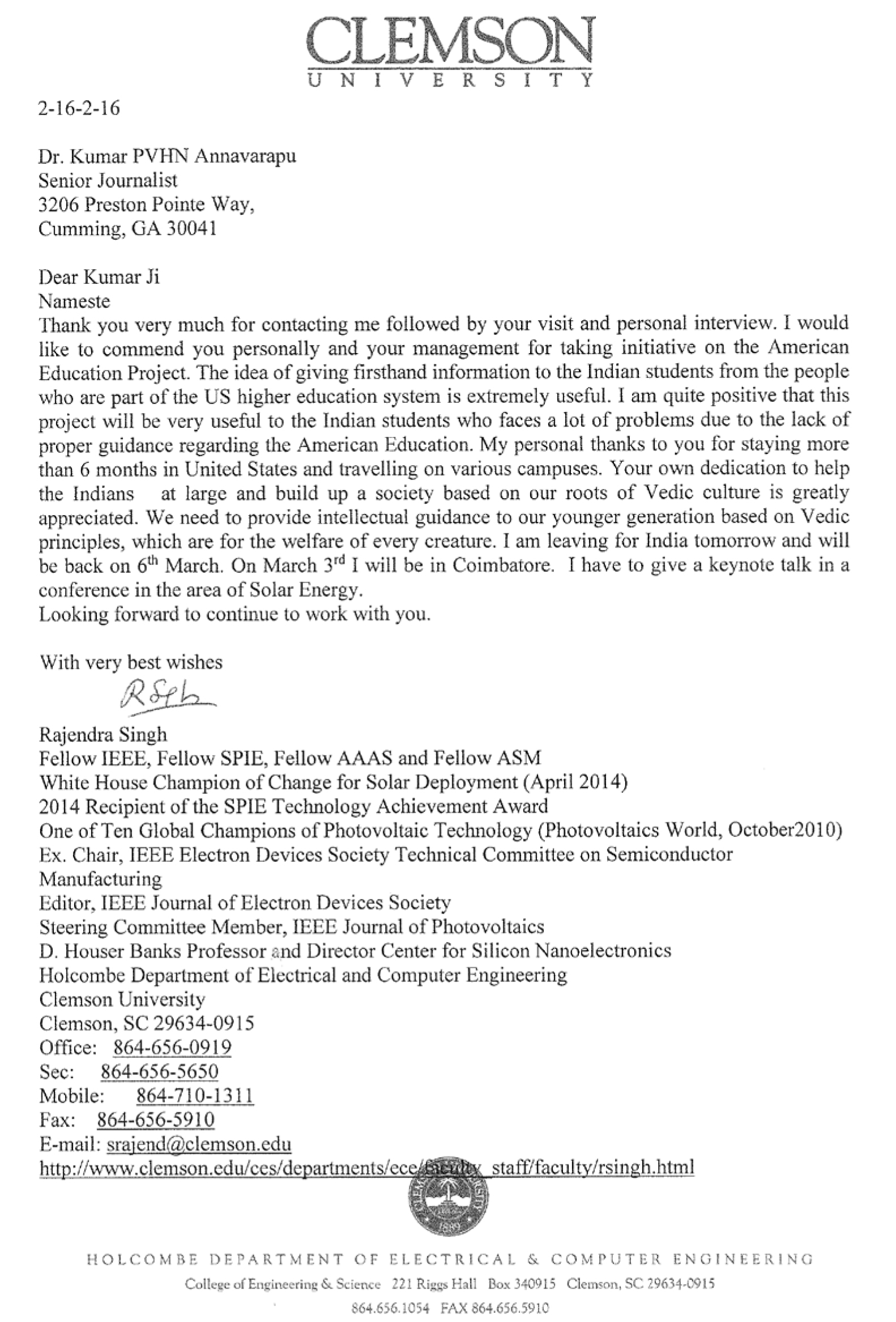 You and the very capable team which was led by you, had put in enormous time and effort visiting a record number of universities in the U.S. Through the interviews you had conducted with students and faculty you have put the spotlight on those institutions and on the achievements of the faculty of Indian origin in those institutions. I applaud those efforts and express my thanks.